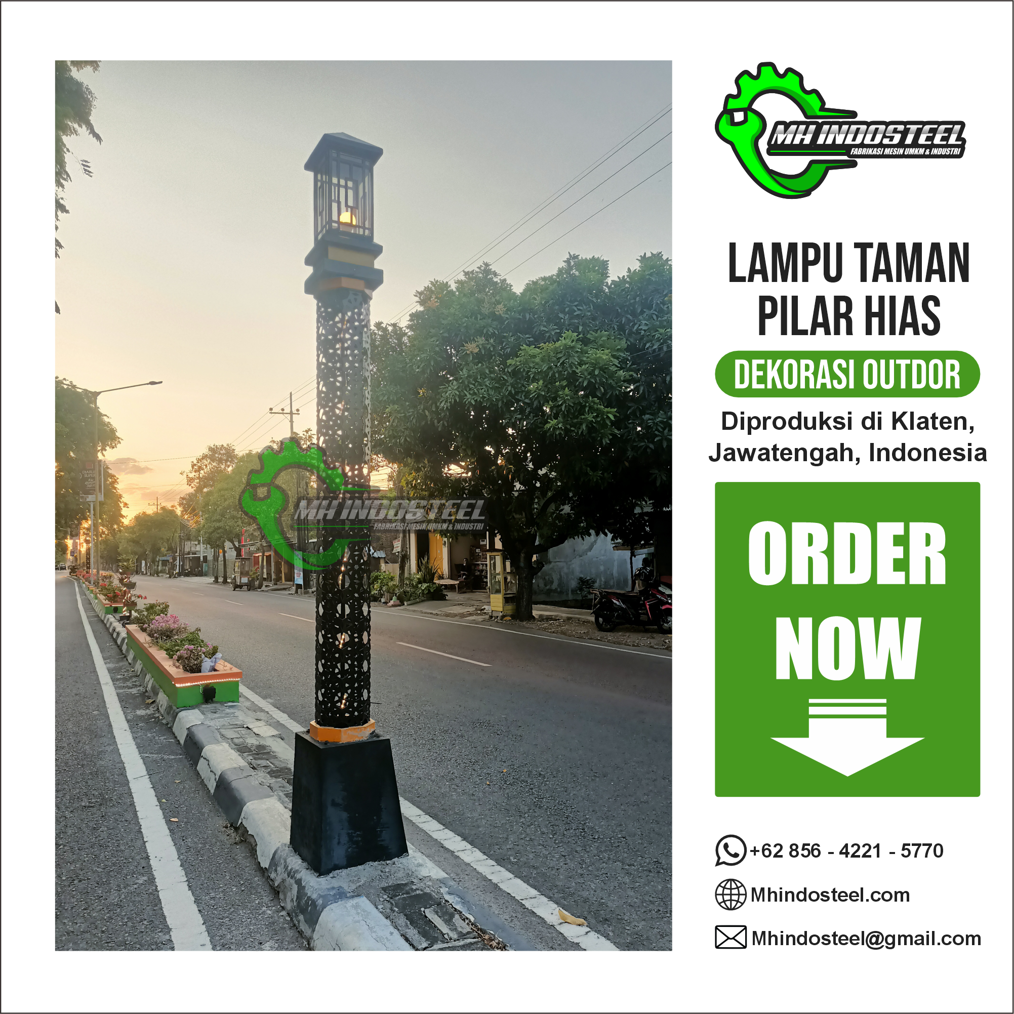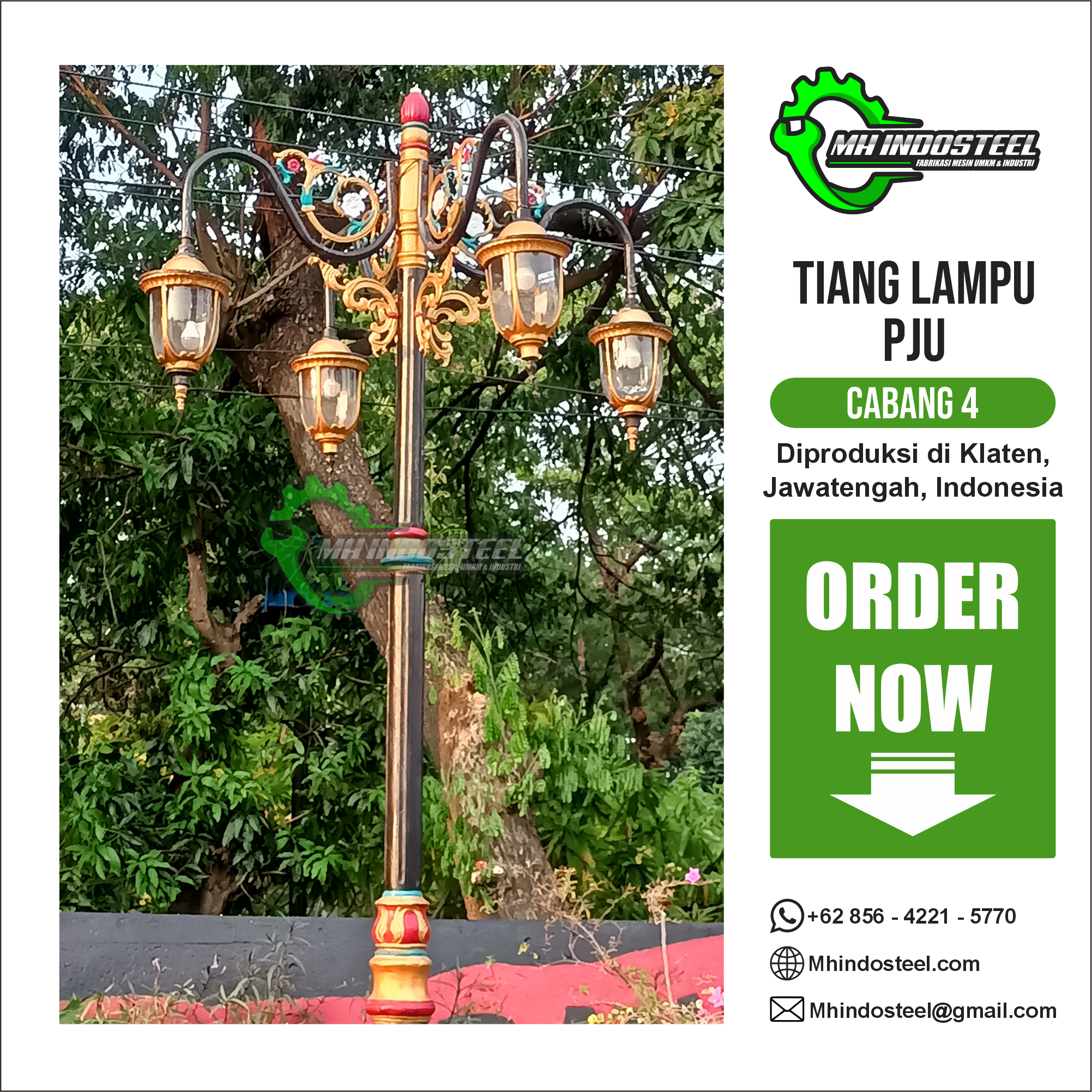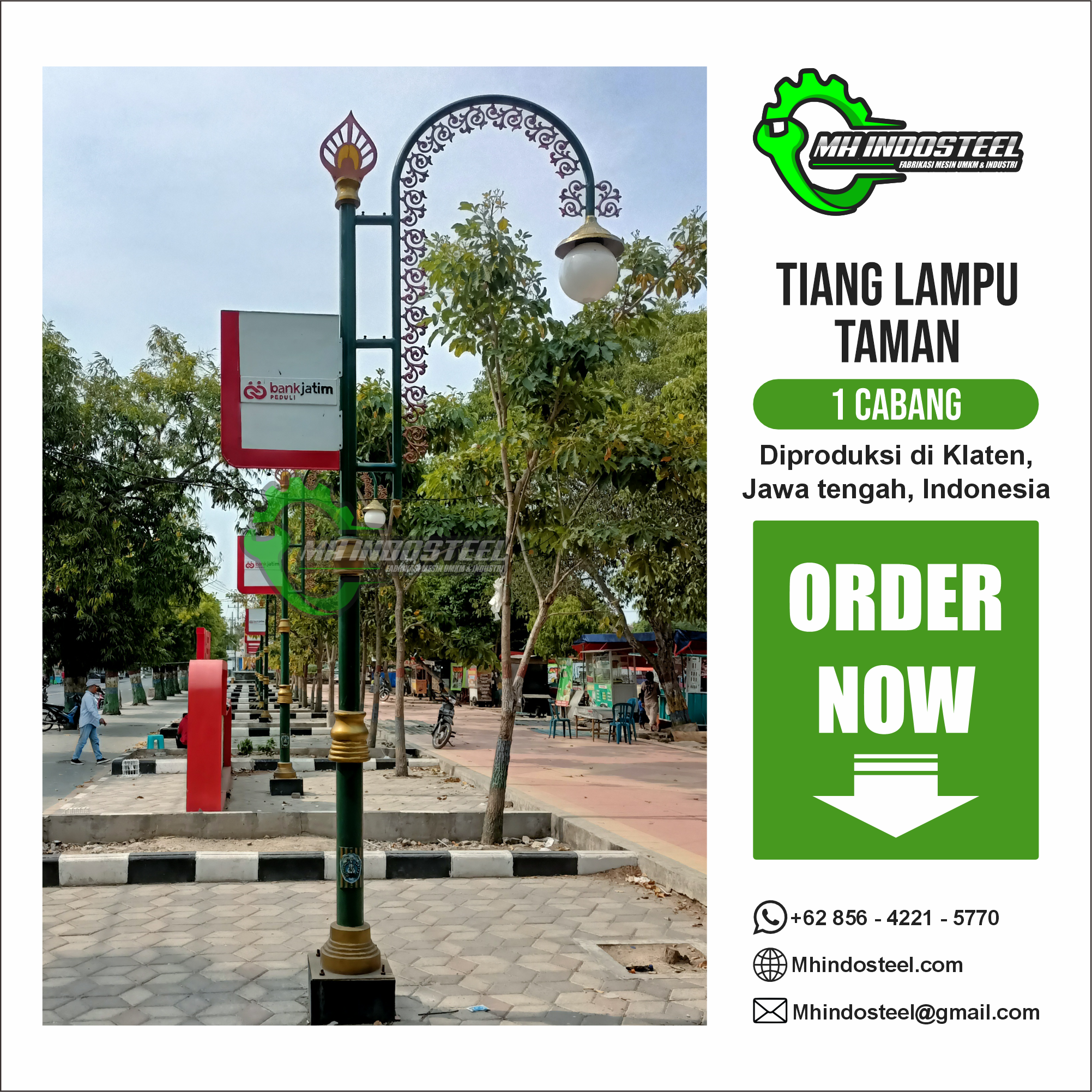 Dibuat dari bahan berkualitas seperti baja, besi cor, atau aluminium, dengan lapisan cat tahan karat untuk ketahanan cuaca. Warna yang umum digunakan adalah hitam, emas, perak, atau kombinasi warna yang mendukung estetika lingkungan sekitarnya.
